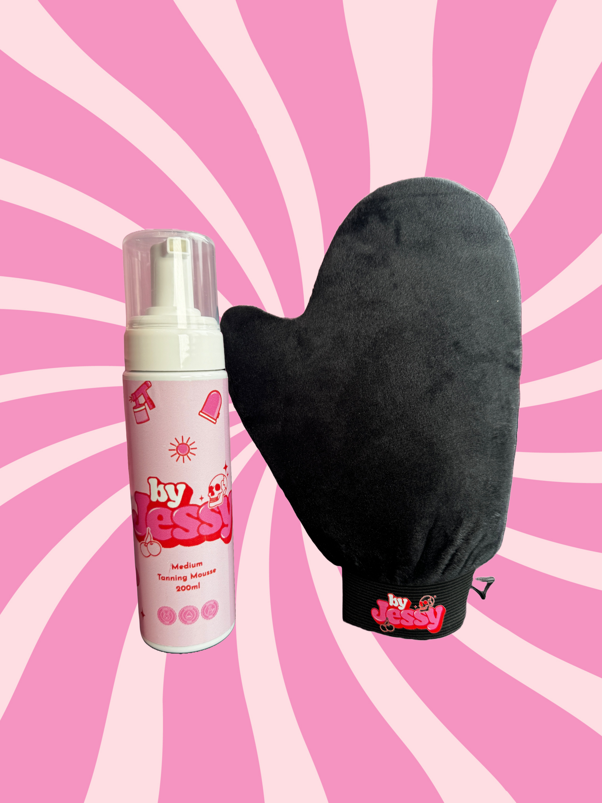 This set includes a medium tan mousse and a by jessy tanning mitt!